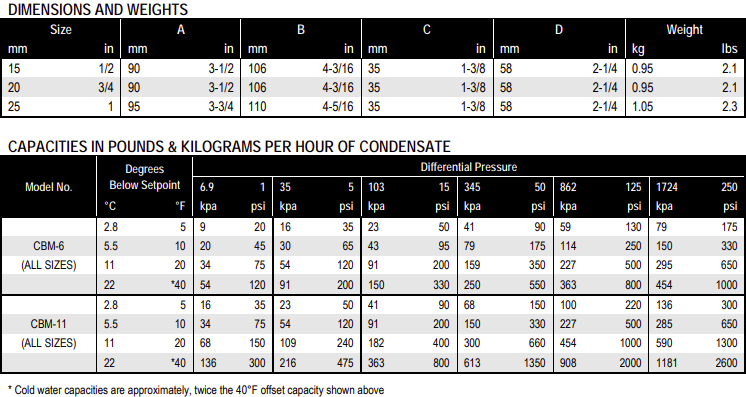 Forged steel body available in sizes 1/2″ to 1″ npt for saturated steam pressures up to 250 psig at temperatures not to exceed 500 deg. F.