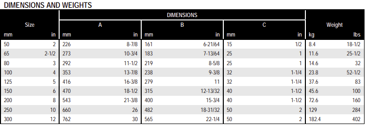 Available in sizes 2″ to 16″ with ANSI 125# FF flanged connections for maximum operating pressures as follows: