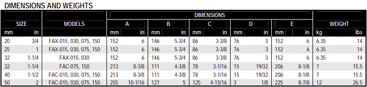 * Except the 1-1/4″ FAC-075, 150 and all 1-1/2″ and 2″ models which are piped through the cover